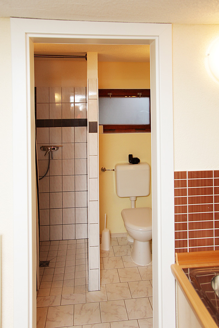Dusche, Waschtisch, WC, Spiegelschrank, Handtuchablage, Handtuchheizkörper